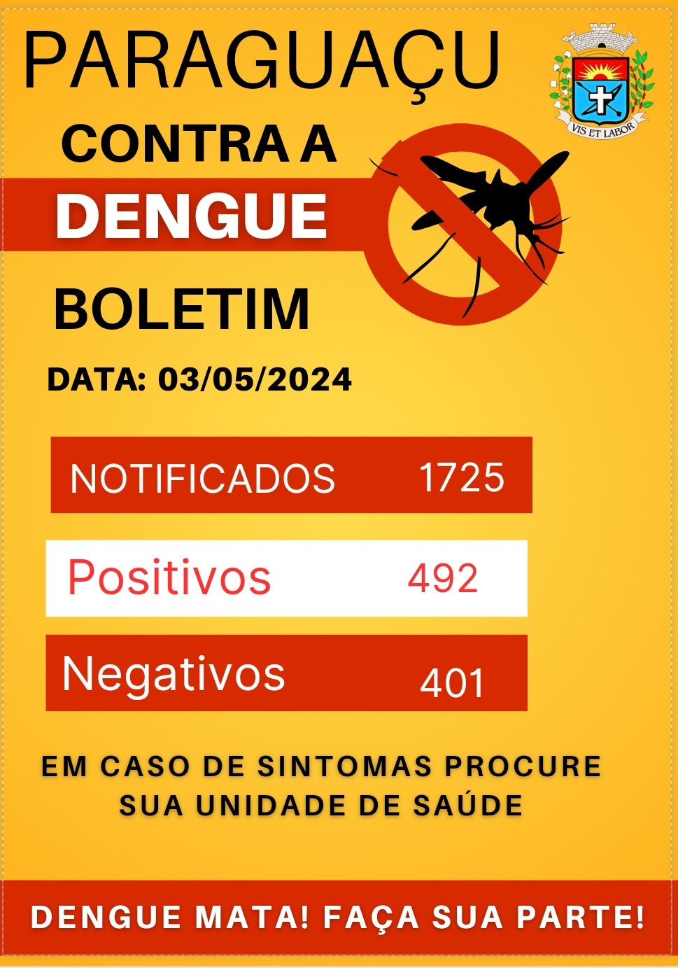 Segundo o boletim, até o momento 1725 pessoas foram notificadas,492 tiveram resultados positivos para dengue e 401 negativos.